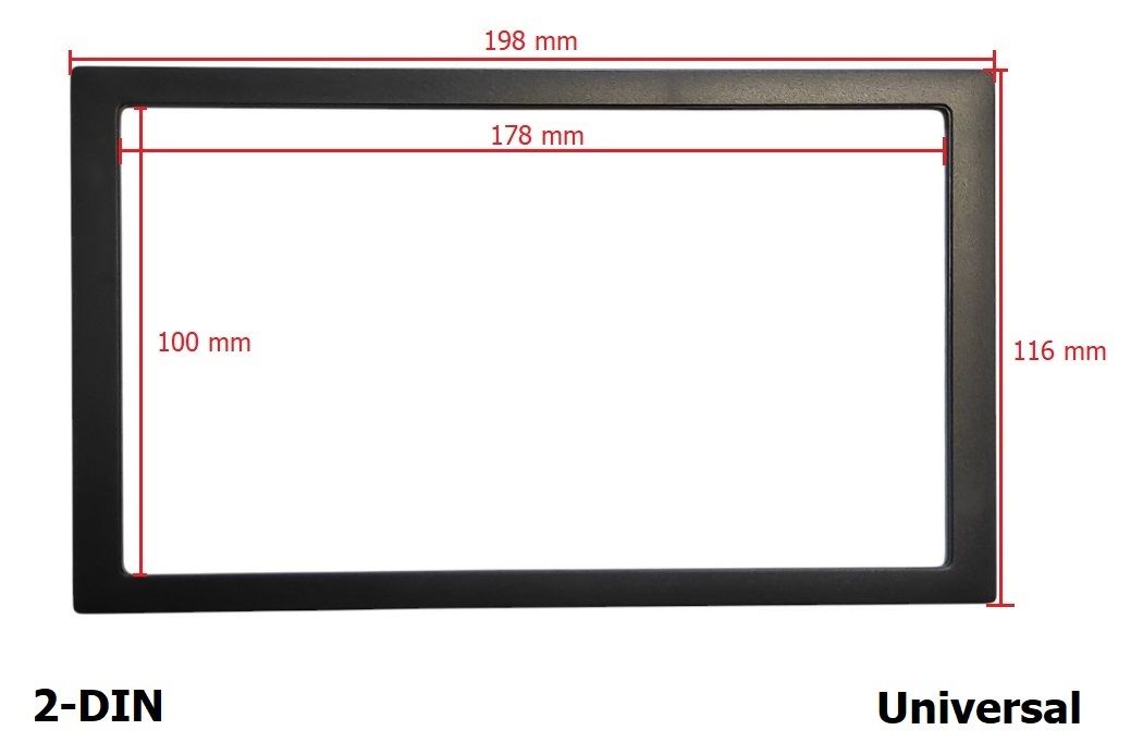Декоративна універсальна рамка для встановлення автомагнітоли: 2 DIN – 198 x 116 mm. Колір: чорний. Розміри: зовнішній – 198 х 116 mm; внутрішній - 178 х 100 мм.