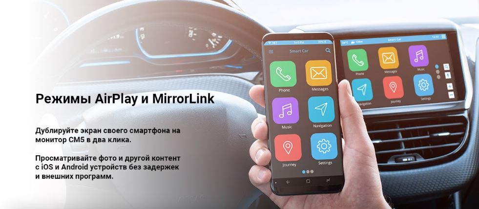 Дублирование экрана смартфона на монитор Gazer CM5510-GP стало возможно, благодаря функциям AirPlay (iOS) и MirrorLink (Android). Мультимедиа или GPS навигация на 10.1 дюймовом дисплее способствует удобству совместного просмотра данных. Теперь делиться впечатлениями стало намного удобнее, ведь просмотр фото с 5 дюймового дисплея смартфона на 10.1" монитор системы Gazer стал реален.